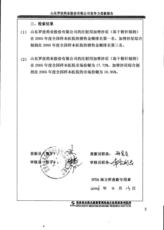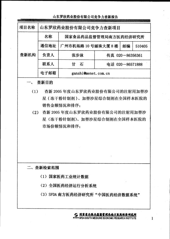 山東羅欣藥業股份有限公司競爭力查新報告(2006-4-13)