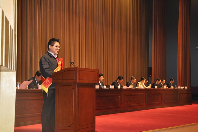 上圖為我公司職工高瑞照上臺發言時的情景