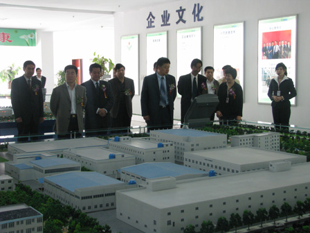 上圖為揭牌慶典儀式結束后沈陽藥科大學校長吳春福(前排左四),臨沂市委常委、市委秘書長李峰(前排左二),市政府黨組成員、市長助理宋法亮(前排左三)等領導參觀公司展廳時的情景