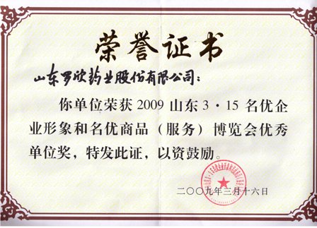 2009年3月15日,我公司參加由山東省消費者協(xié)會主辦的2009年山東3•15名優(yōu)企業(yè)形象和名優(yōu)商品(服務(wù))博覽會,榮獲“2009年山東3•15名優(yōu)企業(yè)形象和名優(yōu)商品(服務(wù))博覽會優(yōu)秀單位獎”。
